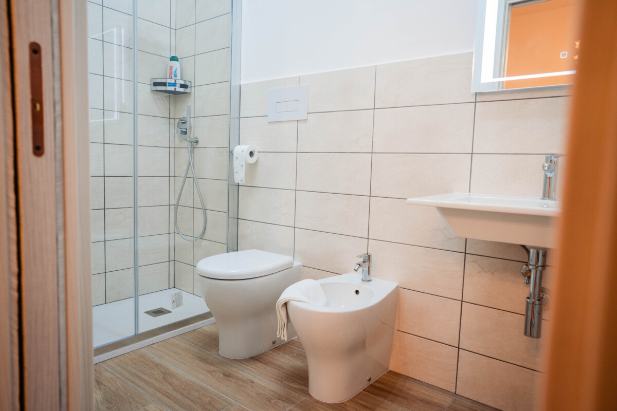 We got what you need; each bathroom has a shower dish, WC, bidet, and sink.