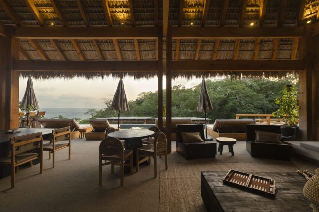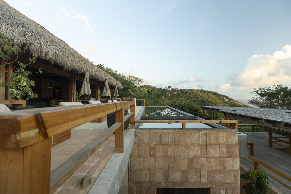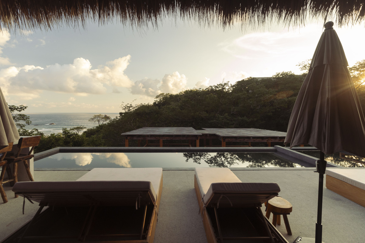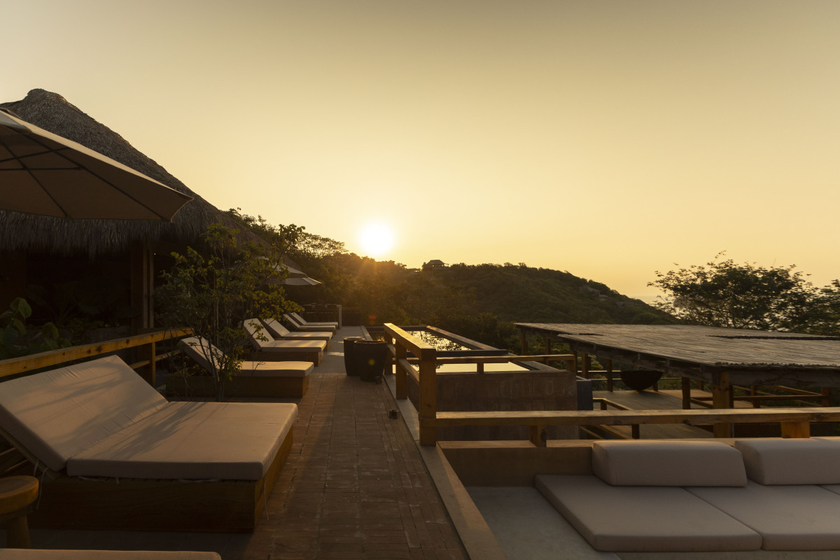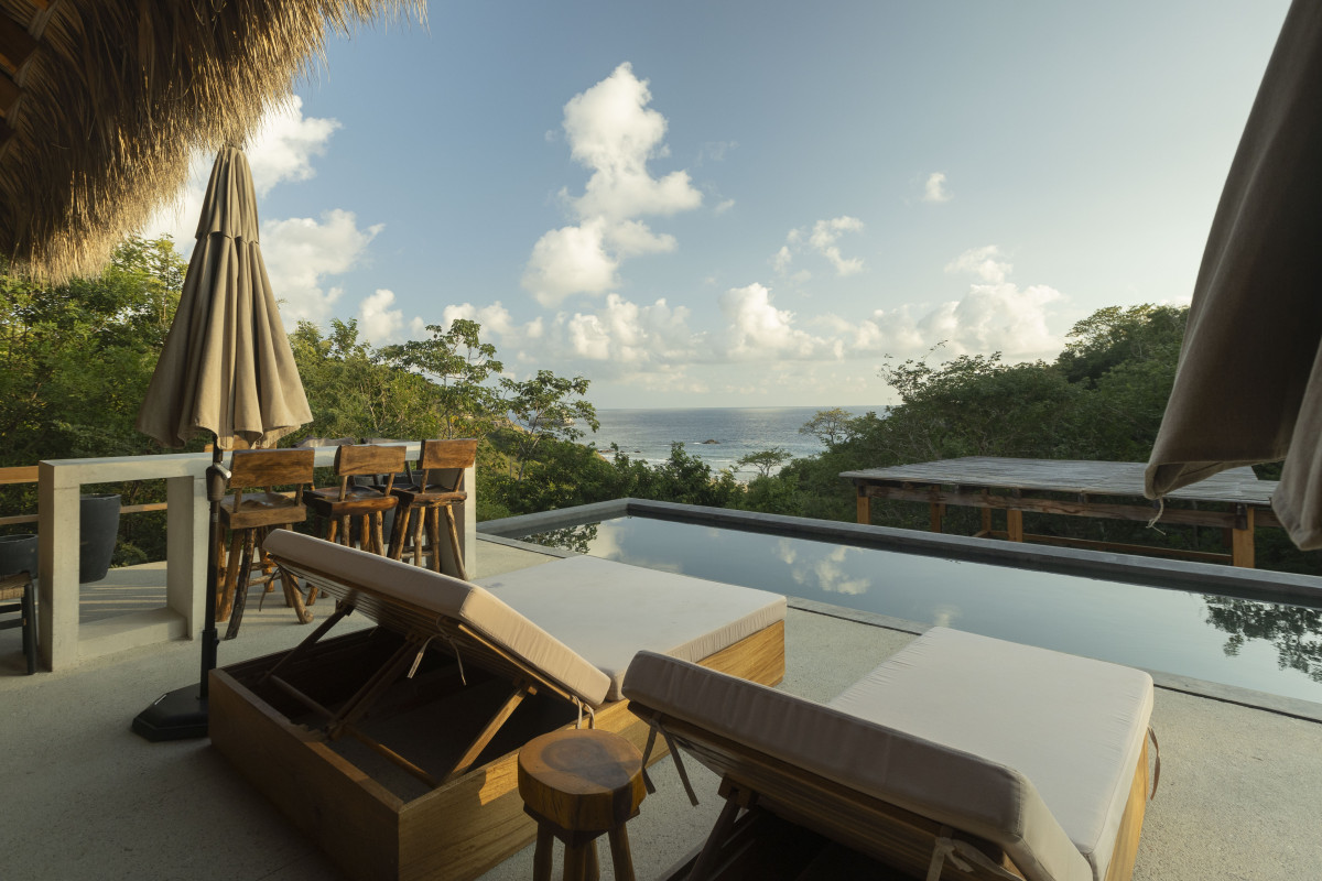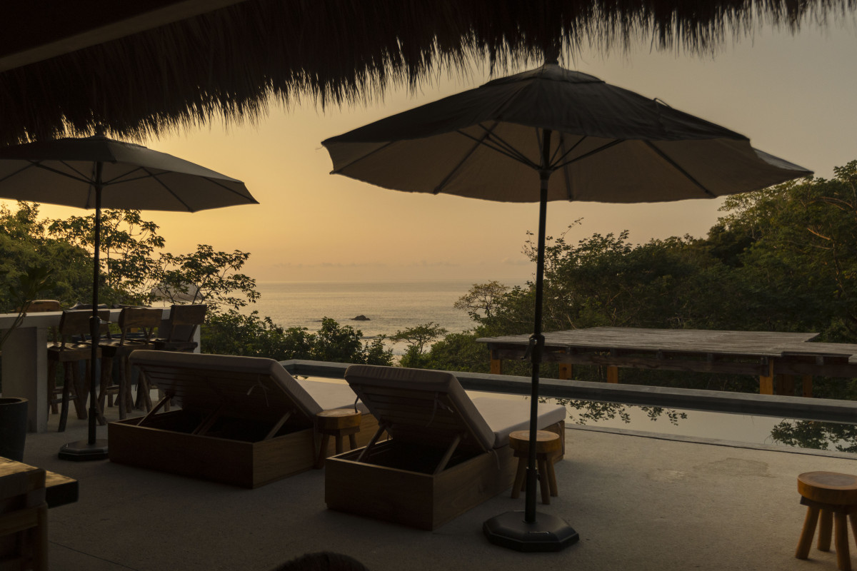 We have a beautiful outdoor pool and terrace with ocean views, a fire pit area, a partial outdoor yoga shala and a private beach.
