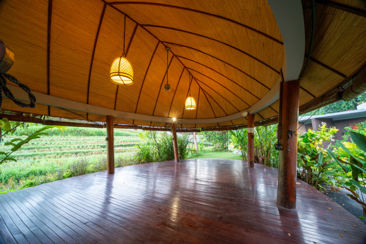 Two open-air yoga shalas equipped with mats, blocks, belts. Yoga Shala is flanked by rice fields and forest, offering a peaceful setting for yoga and mediation practice, or deep personal development work. Each of Yoga Shala can hold up to 22 persons.