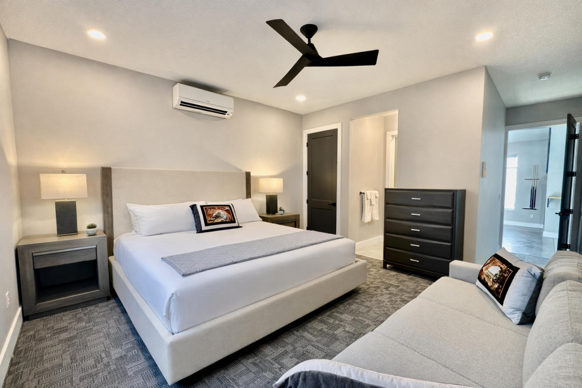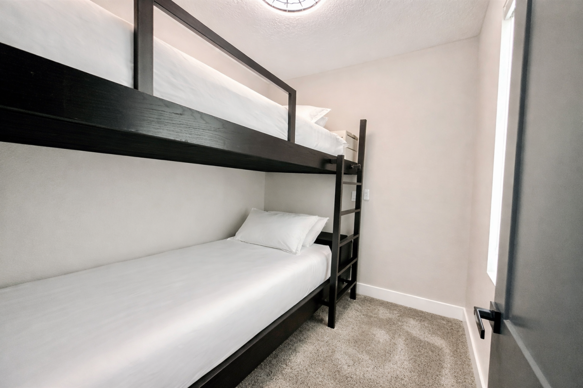 12 spacious suites feature king beds, spa-like ensuite baths, and 50” Smart TVs. Many include queen sleeper sofas, and two suites offer attached bunkrooms. Two family suites include king and queen beds with XL twin-over bunks. Additional bedding includes 4 memory foam guest beds and a queen pullout in the great room—perfect for large groups.