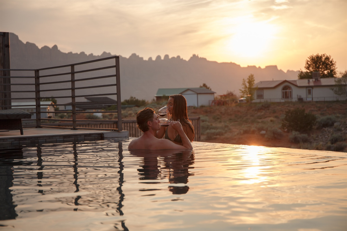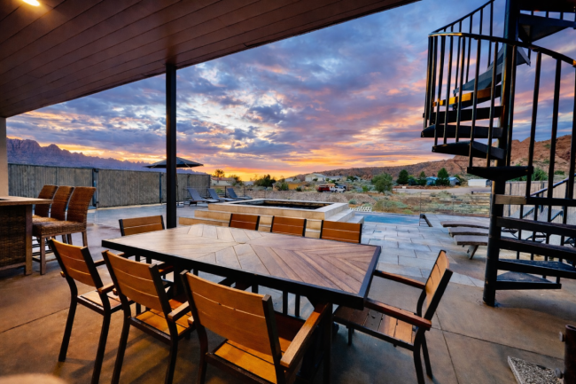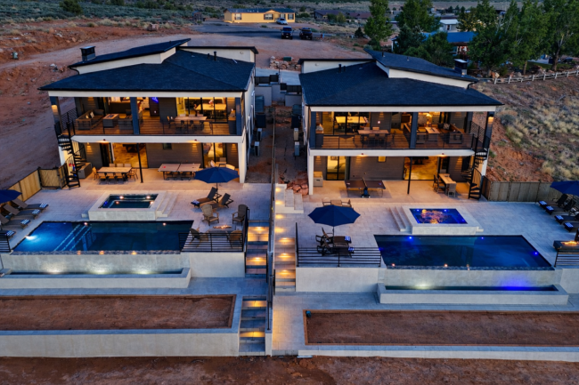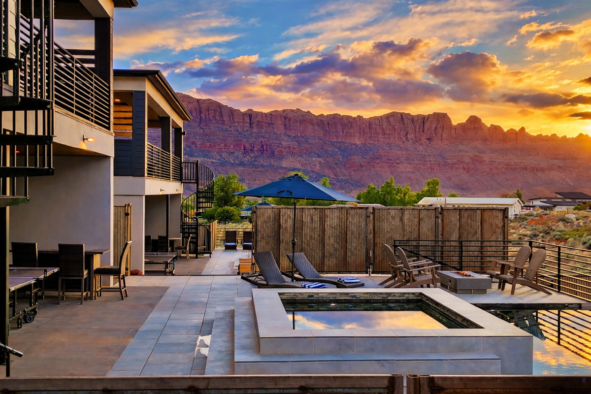 Enjoy two private heated pools (82° summer / 92° winter), two 12-person hot tubs, expansive patios with La Sal Mountain views, gas fire pits, BBQ grills, bocce court, pool table, ping pong, and paddle boards for nearby Ken’s Lake or the Colorado River. There’s parking for 20+ vehicles, trailers, and RVs.