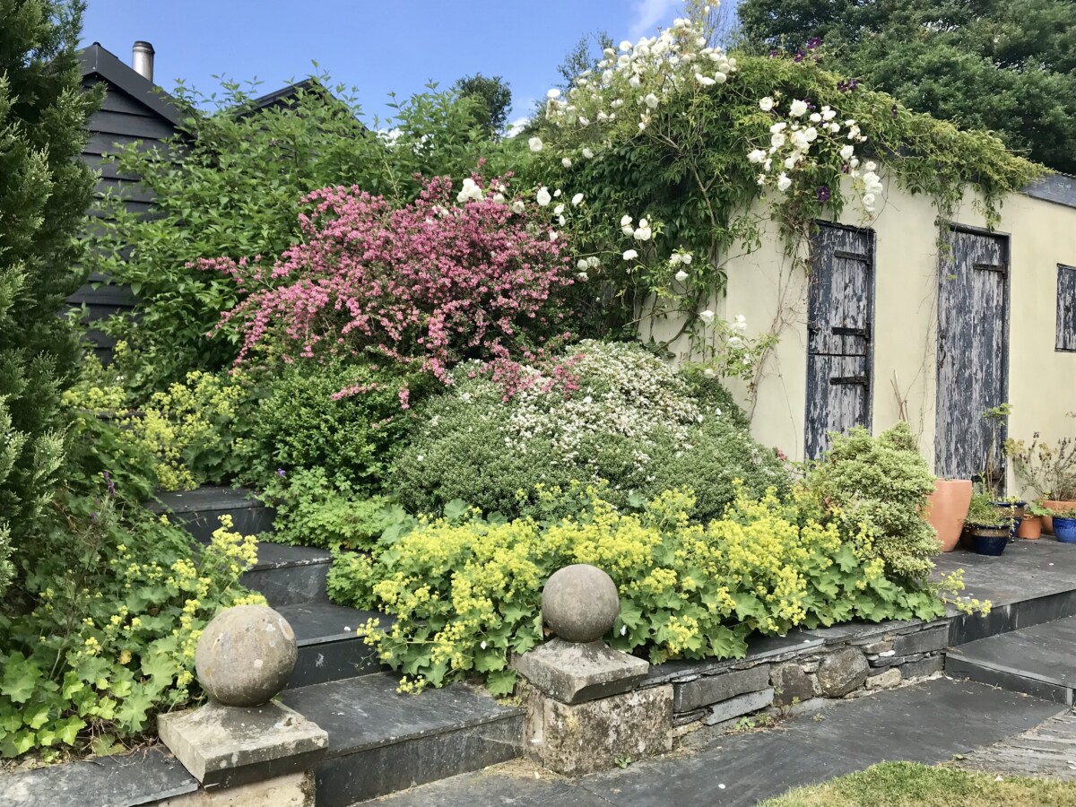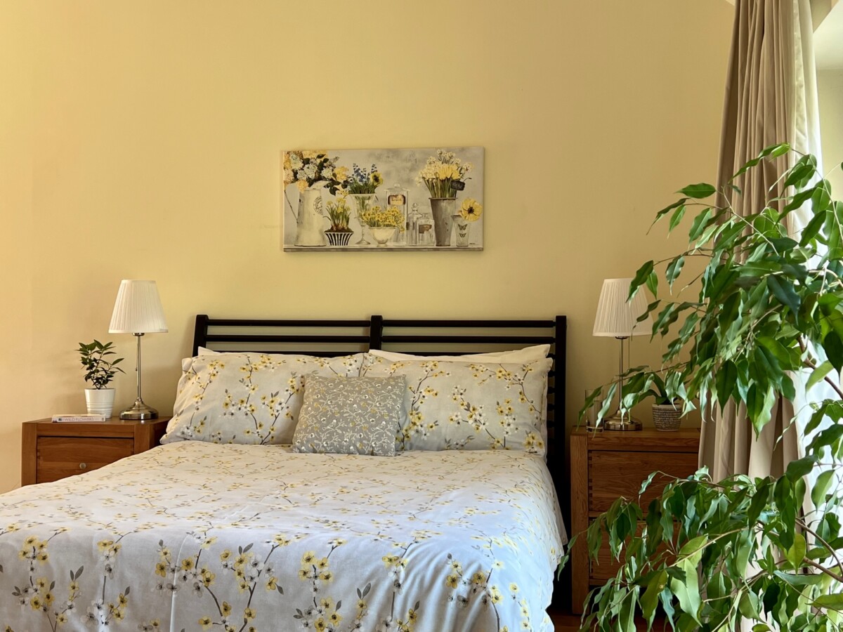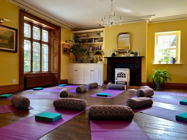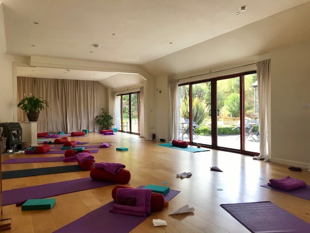 The Yoga Shala is a 70 sq metre space in Hafod Barn, with underfloor heating provided by our biomass boiler. It has a smooth oak surface with floor length natural linen curtains at both ends and along the large opening French windows. Plants are provided and yoga equipment is available if required for a small supplement. Adjoining the shala there is a wc and sitting room with views to the garden