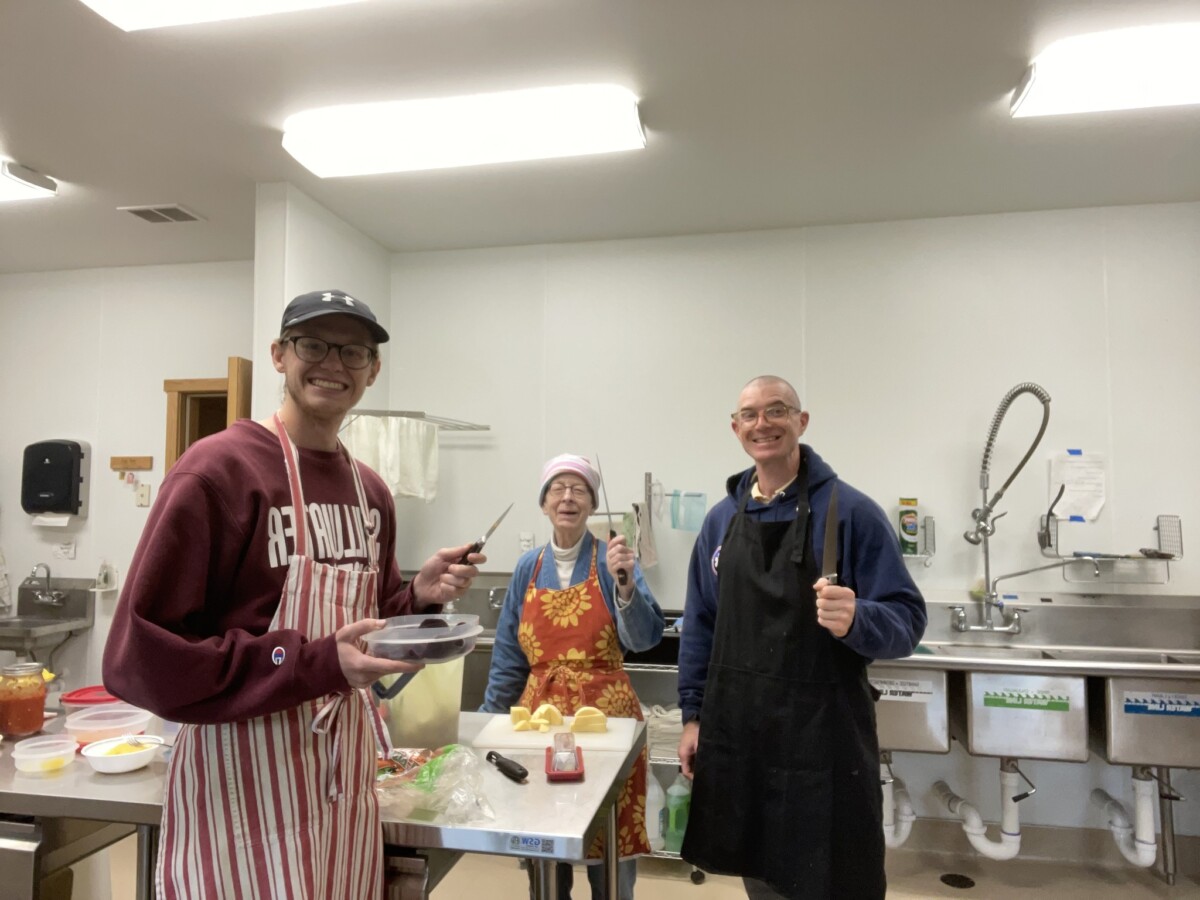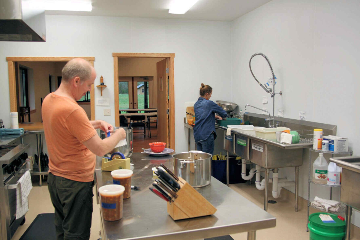 Mauss Hall would comfortably seat 50 for a meal. Our kitchen is commercial quality, and includes a six-burner stove, an oven, and generous counter space, making it ideal for group meal preparation.