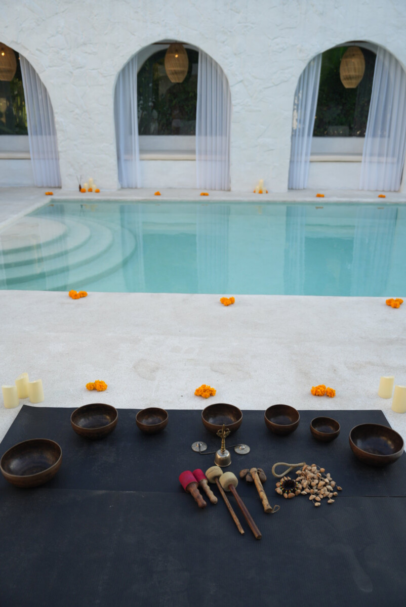 Includes a serene pool, mineral bath, cold plunge, jacuzzi, sauna, open-air yoga shala—perfect for relaxation and outdoor sessions.