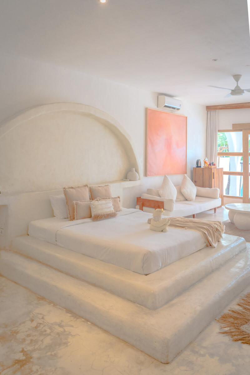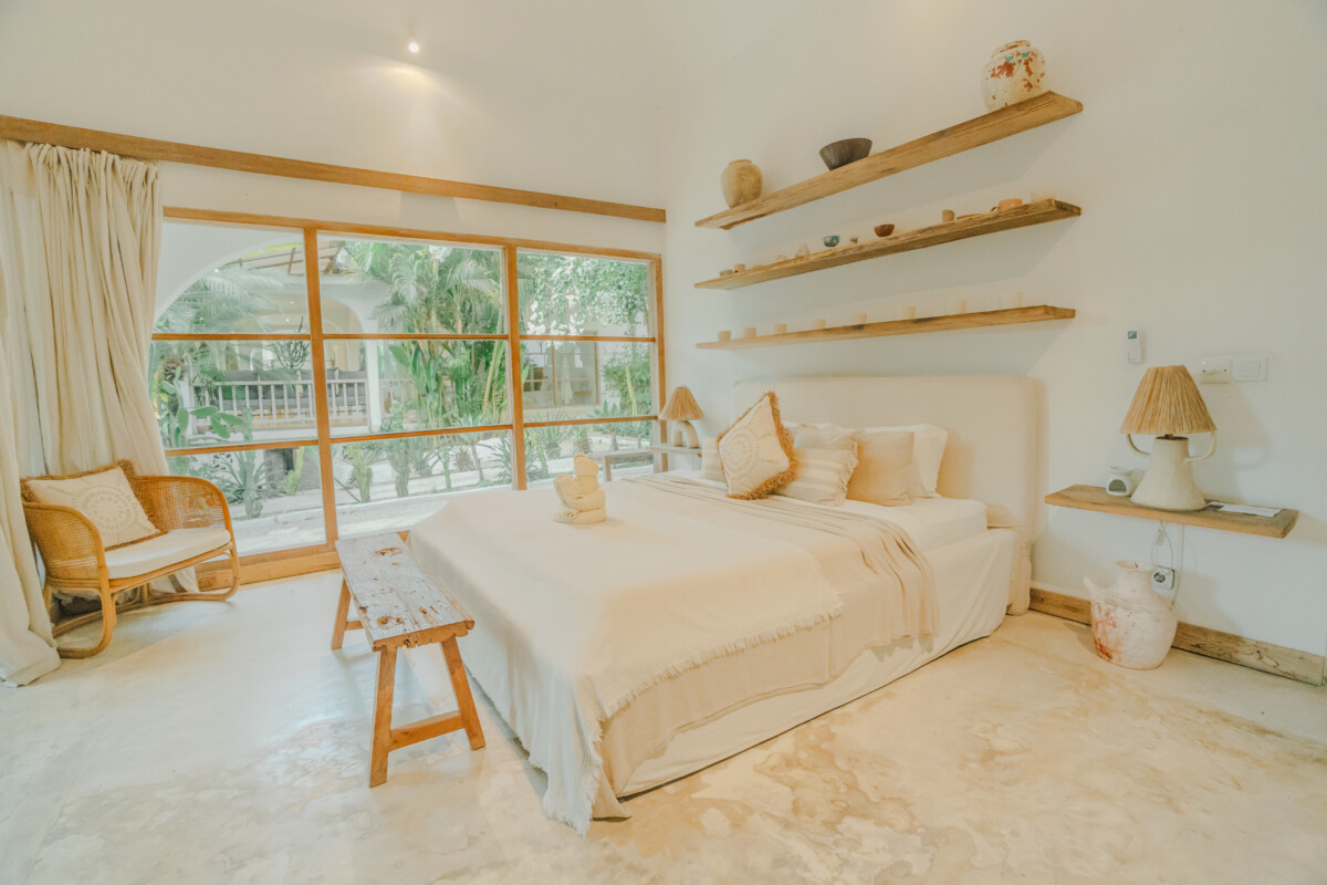 Stylish, spacious rooms with king size beds, AC, luxury linens, and. in room amenities. A tranquil space to unwind after a day of exploration or retreat activities.