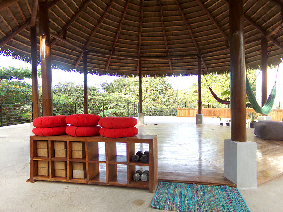 Our covered yoga studio comfortably hosts up to 8 mats, while the uncovered portion (recommended during high season only) hosts another 7 mats. Props included: mats, bolsters, zabuton meditation cushions, zafu meditation cushions, blankets, blocks and straps.