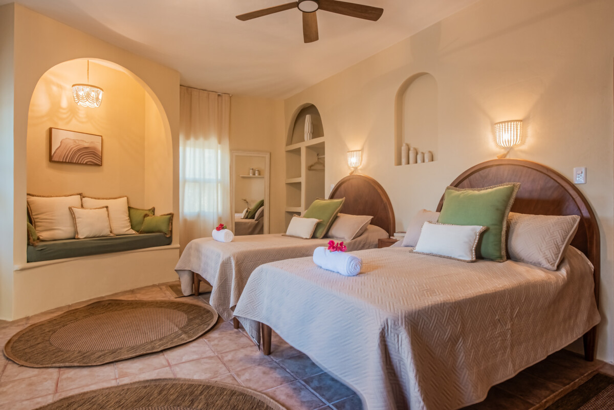 The retreat center features flexible practice spaces, including a spacious open-air yoga shala overlooking the ocean and a shaded garden palapa ideal for workshops, meditation, or movement practices. Accommodations range from elegant suites to shared rooms, all thoughtfully designed with locally crafted furnishings, bamboo linens, and eco-friendly amenities. Each room combines rustic charm with modern comfort, providing your participants a restful stay.