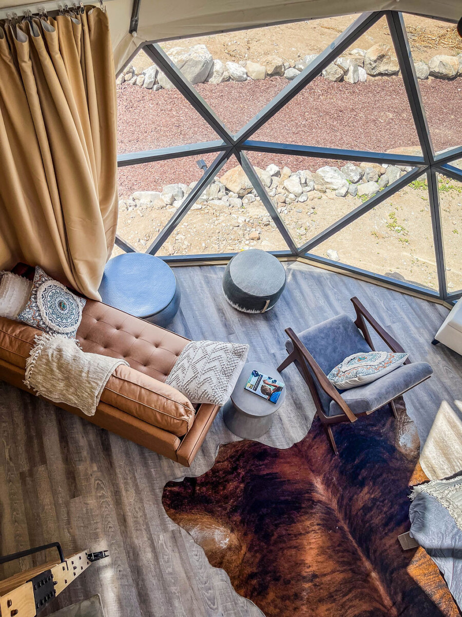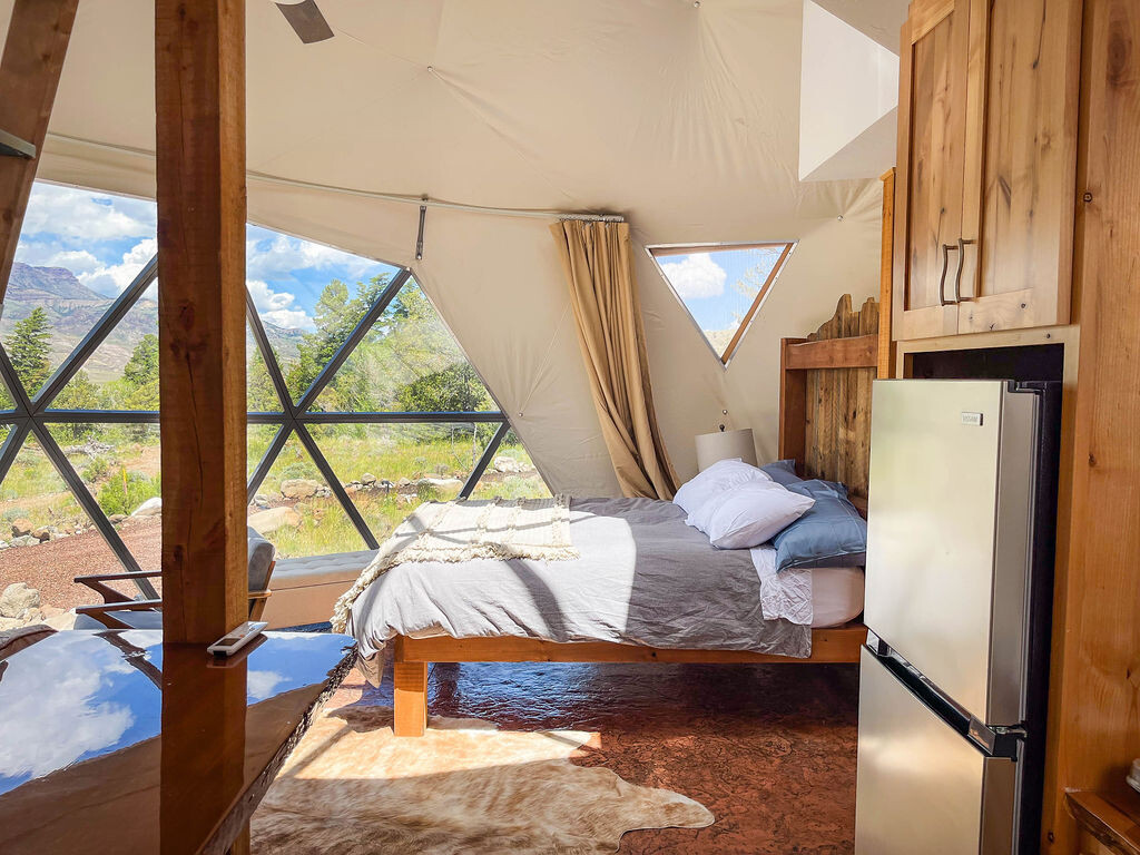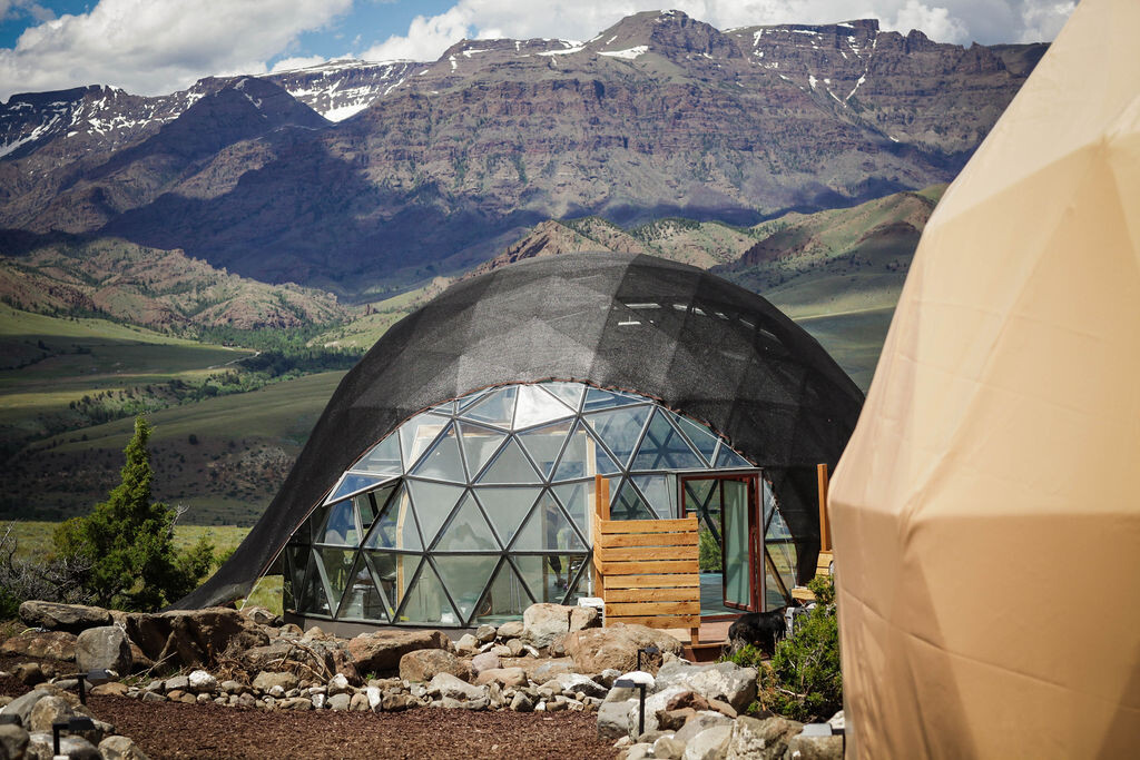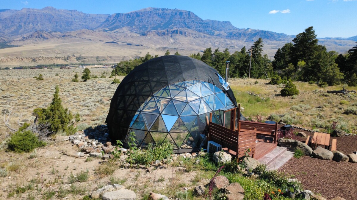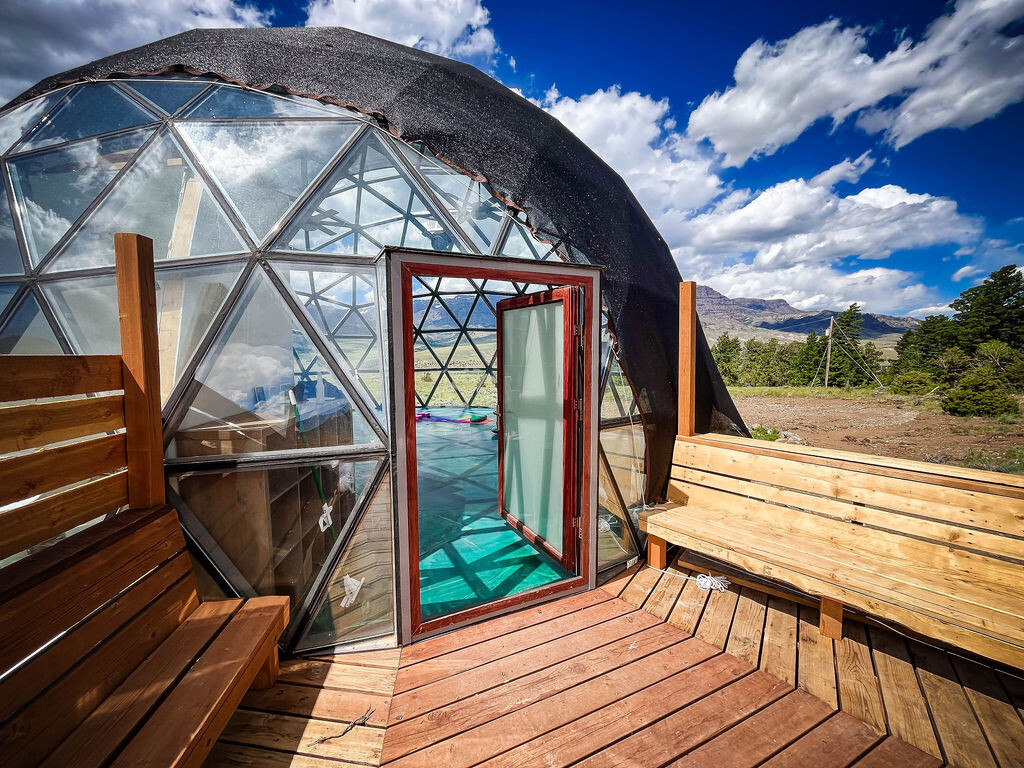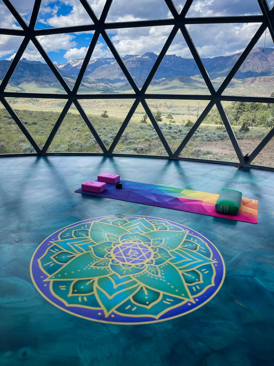 The all glass, geodesic dome studio offers 360 degree mountain views. Stocked with mats, blocks, straps, small bolsters, and meditation cushions, bathroom, and wood stove. Hot yoga, candlelit yoga, sunrise, sunset are all amazing. Sound baths, singing, drums, all enhanced by the geodesic structure.