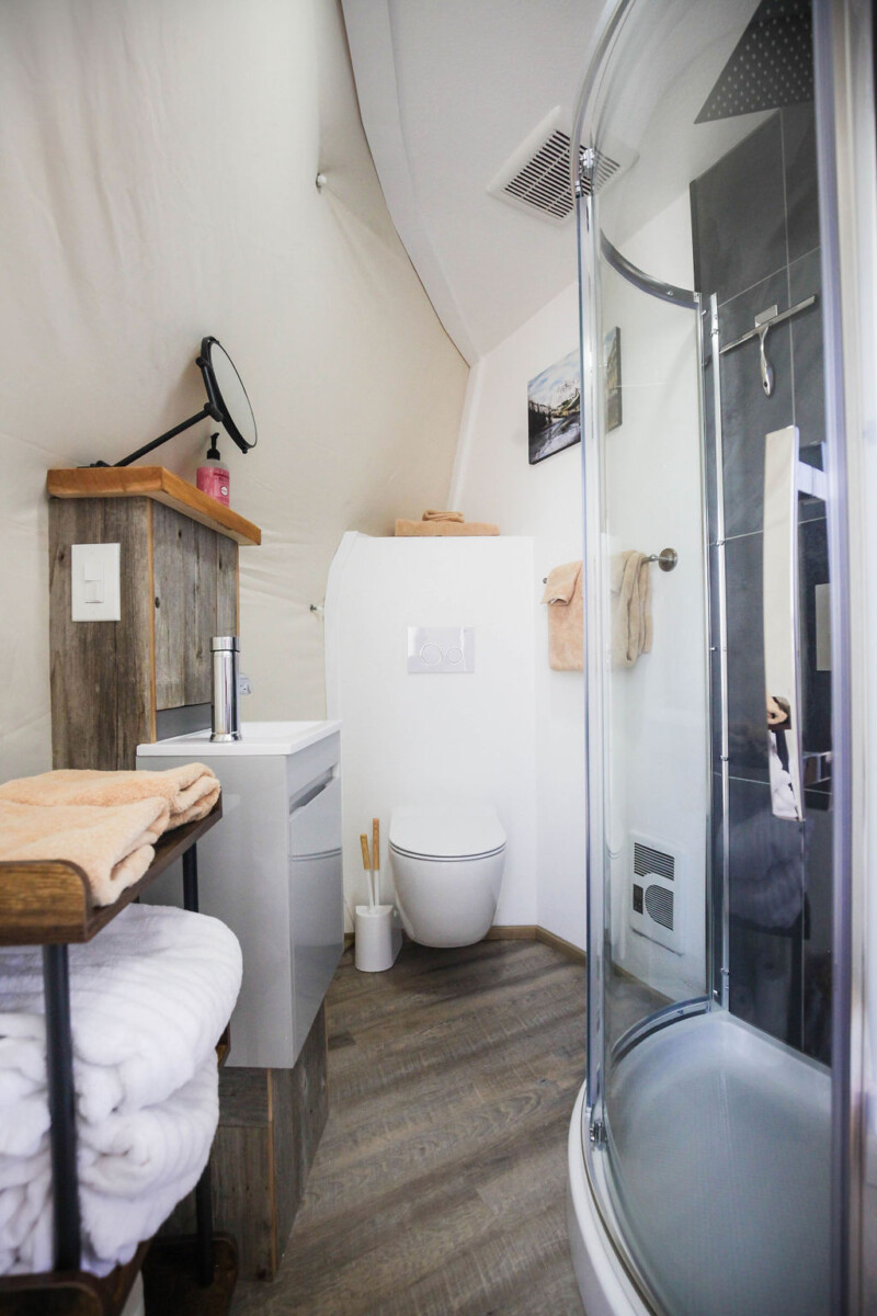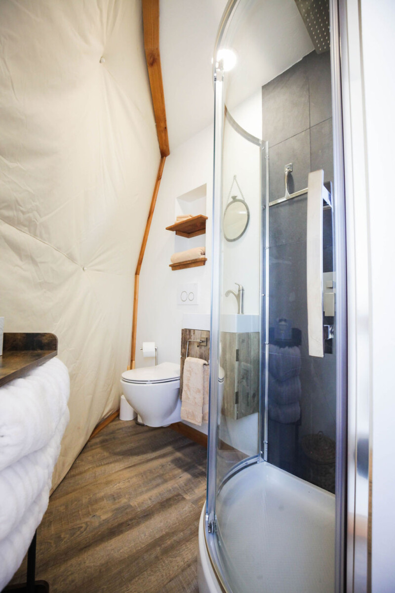 Each of the four lodging domes has an ensuite bathroom with shower. The studio has a bathroom with no shower, and the facilitator apartment has a bathroom with steam shower.
