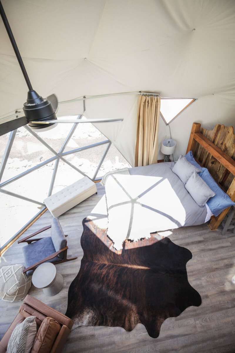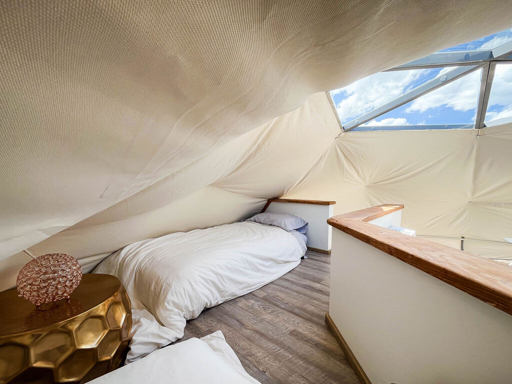 Each of the four lodging domes has a queen bed on the ground floor. 3 of the domes have two twin beds in the loft, and one dome has only one twin in its loft. The facilitator apartment has a queen.