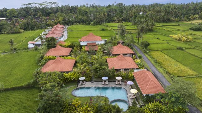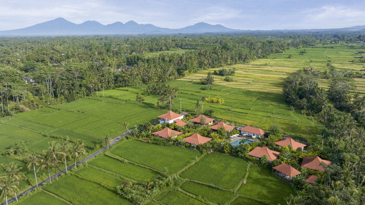 Ricefield Serenity Retreat is a peaceful Ubud escape, 15 minutes from the center. Surrounded by rice fields, it features a large yoga shala, 7 two-bedroom villas, and an onsite restaurant.