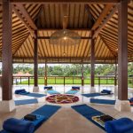 Open-air yoga shala with stunning rice field views, fully equipped with yoga mats and blocks for a comfortable and inspiring practice.