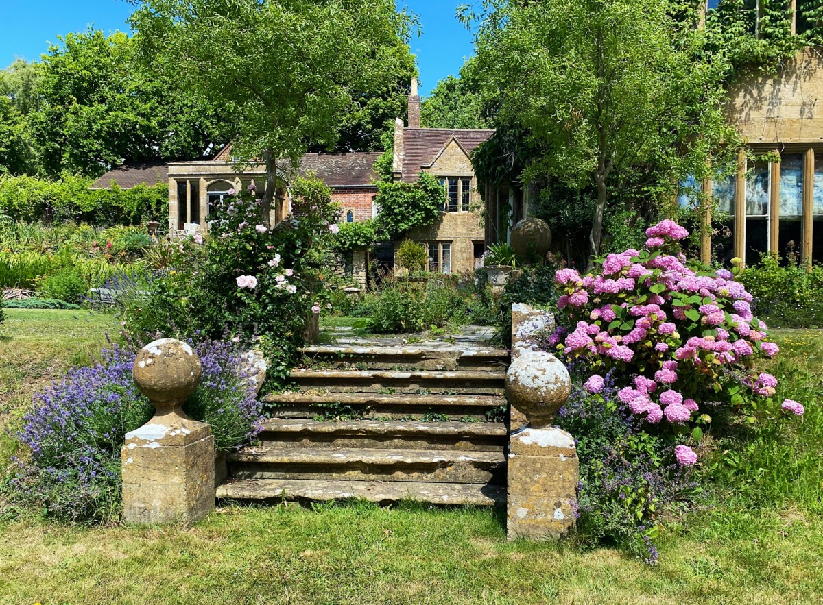 French windows lead onto the terrace, from which there’s an idyllic view of the couple of acres or more of gardens, full of tumbling vines and roses. The back garden is made up of an orchard.