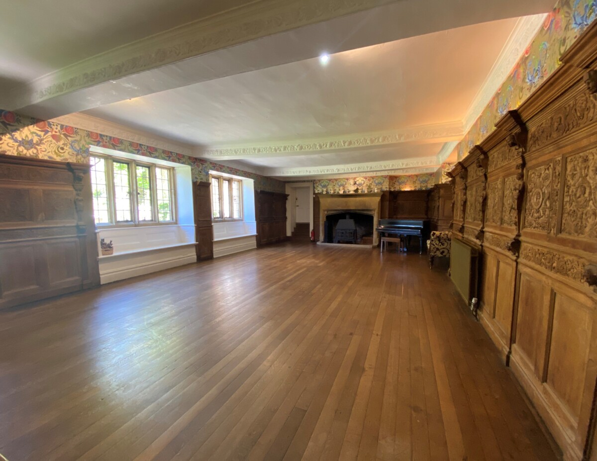 Beautiful wooden panelled ballroom, 35 ft long x 25 ft wide with mullioned windows looking out to the lawns. Equipment not included.