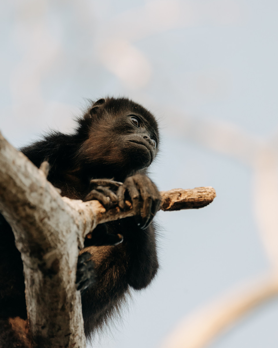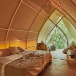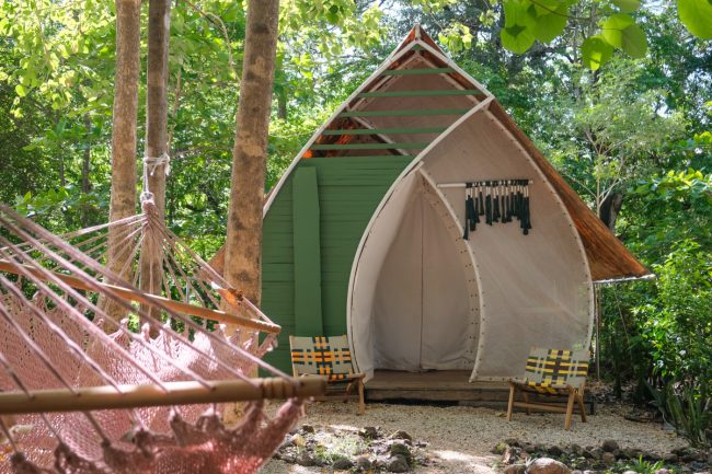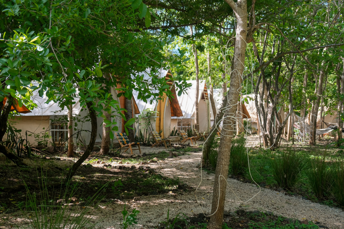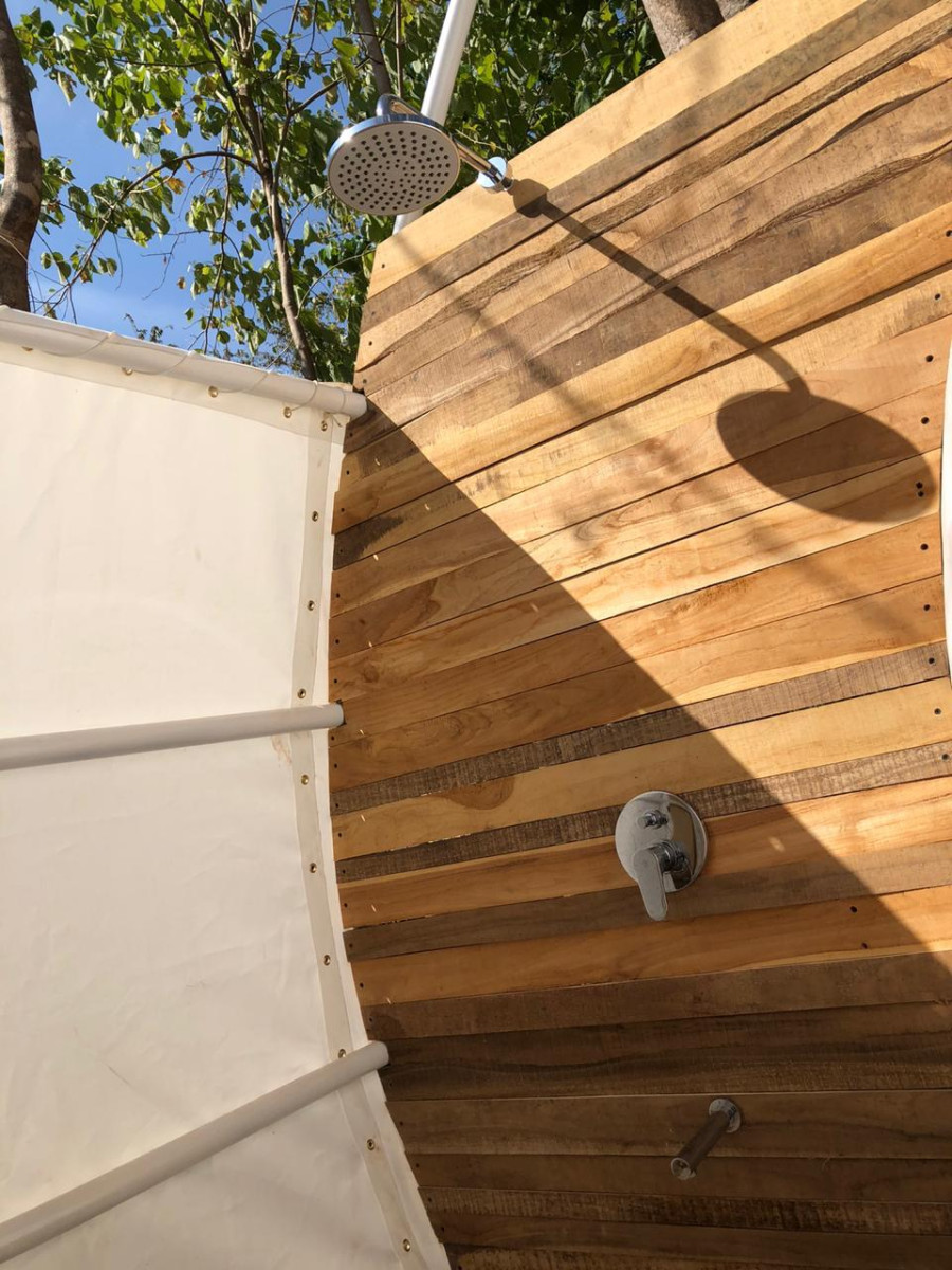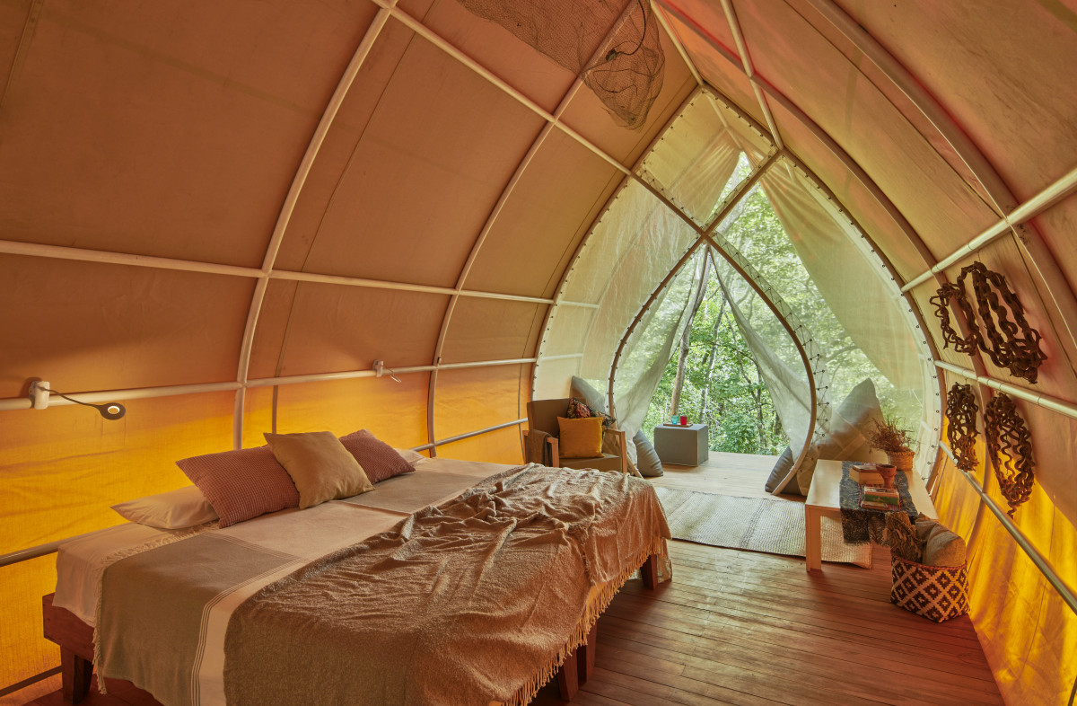 All nine luxury glamping tents can be configured with a king bed or up to three twin beds. Each has a private terrace overlooking the forest. The mesh back wall creates a direct connection to nature, often with howler monkeys passing by. Cooling is provided by movable fans, as well as natural airflow, keeping the space comfortable while immersed in the environment.