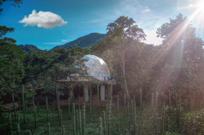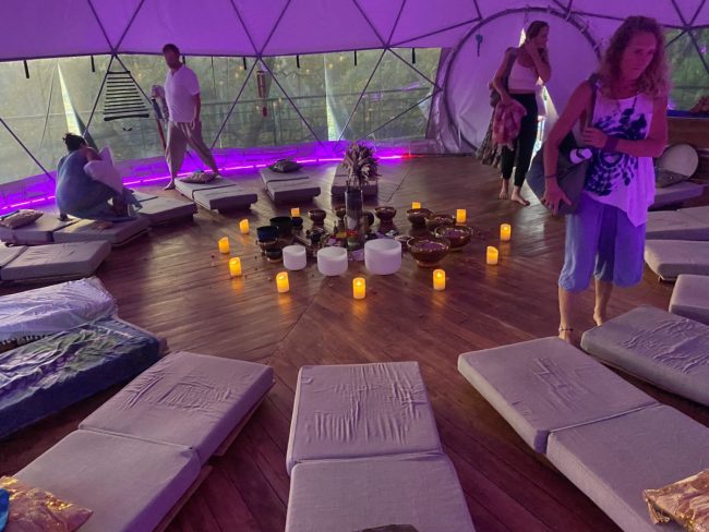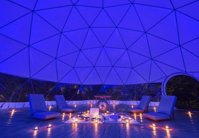 Group sessions are held in a 33-ft air-conditioned geodesic dome, ideal for workshops, movement, meditation, and ceremonies.