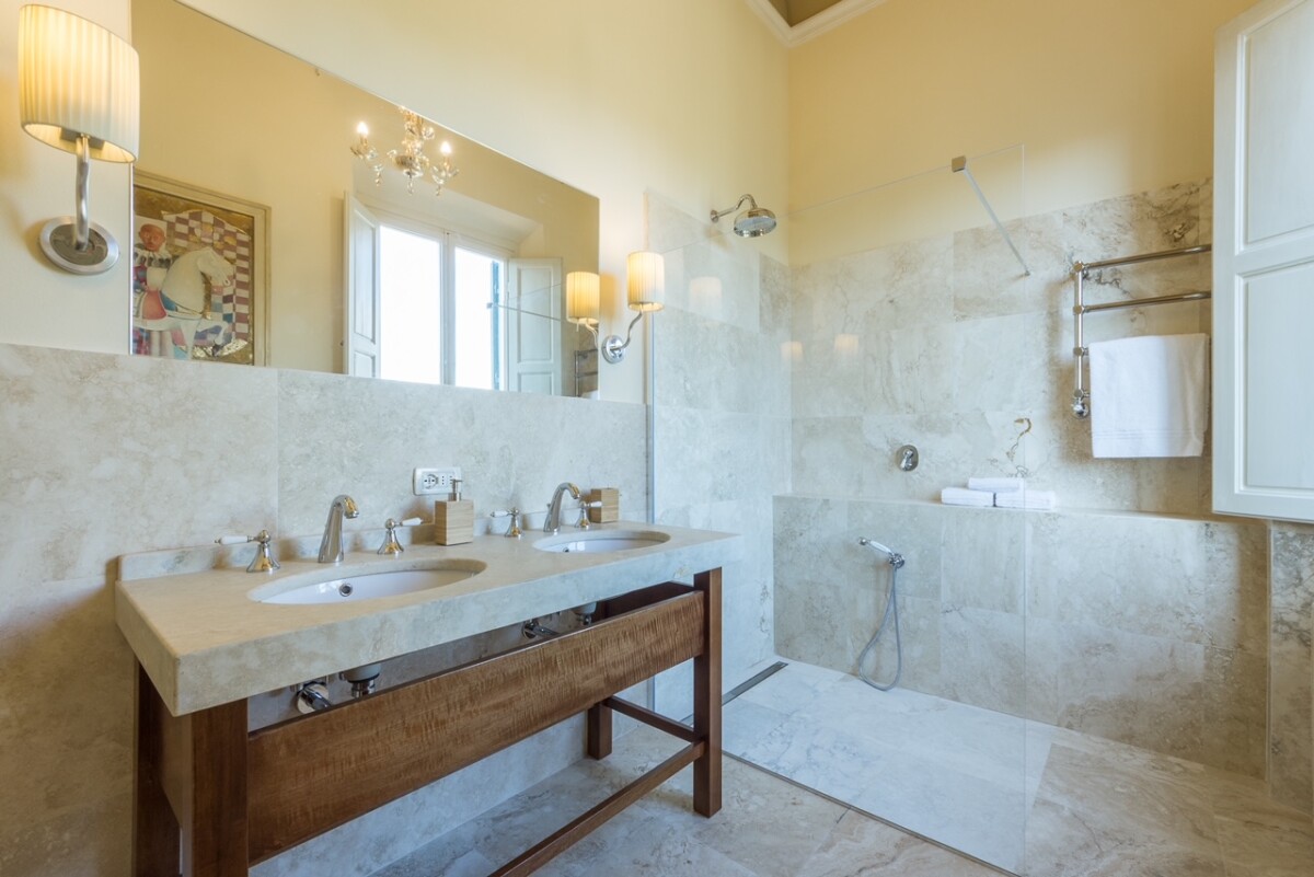 The bathrooms combine Tuscan elegance with modern comfort: travertine stone, marble finishes, spacious walk-in showers, and vintage details. Many rooms feature en-suite bathrooms.