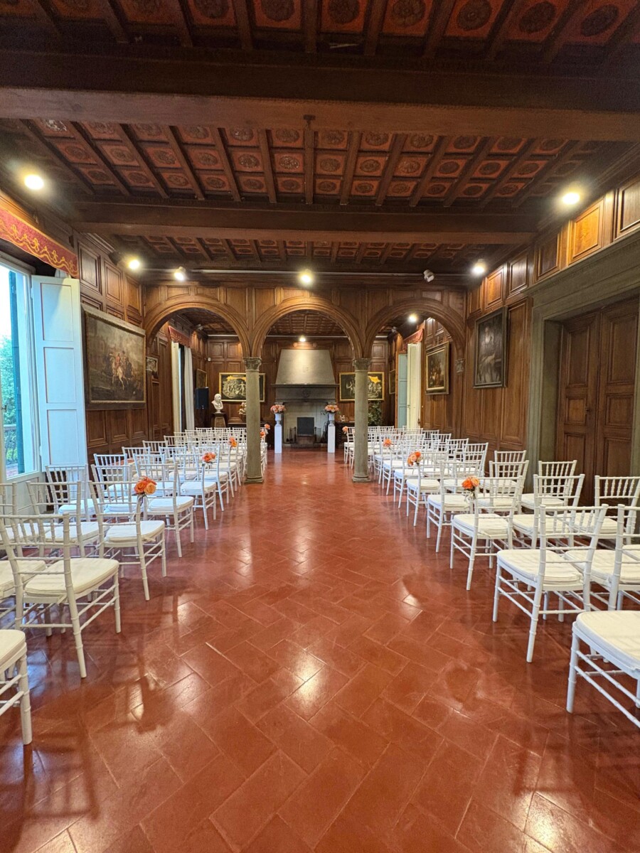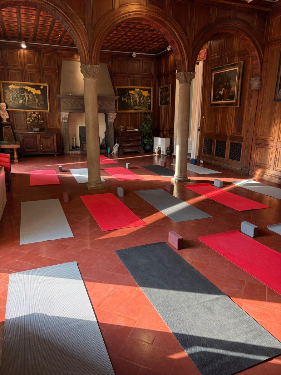 Our elegant Yoga Room accommodates up to 40 participants, offering a serene setting surrounded by Tuscan nature. The Villa hosts 26 guests in refined rooms. Both the Red Banquet Lounge and the Parco Fortuny are available for yoga sessions, meditation, or relaxation breaks, creating a peaceful and inspiring retreat atmosphere.