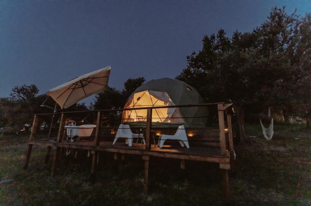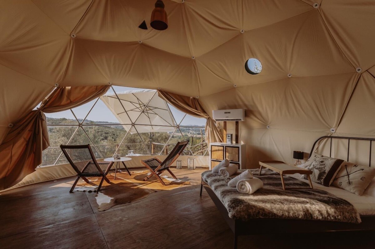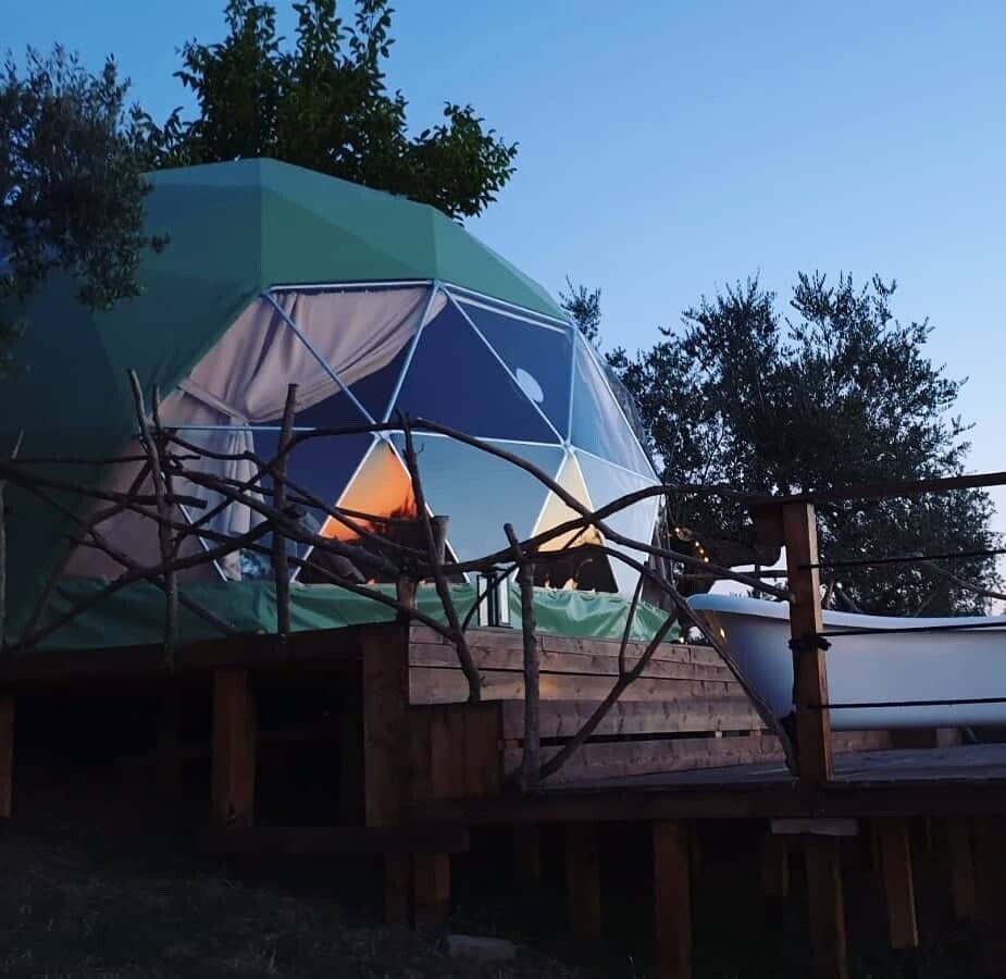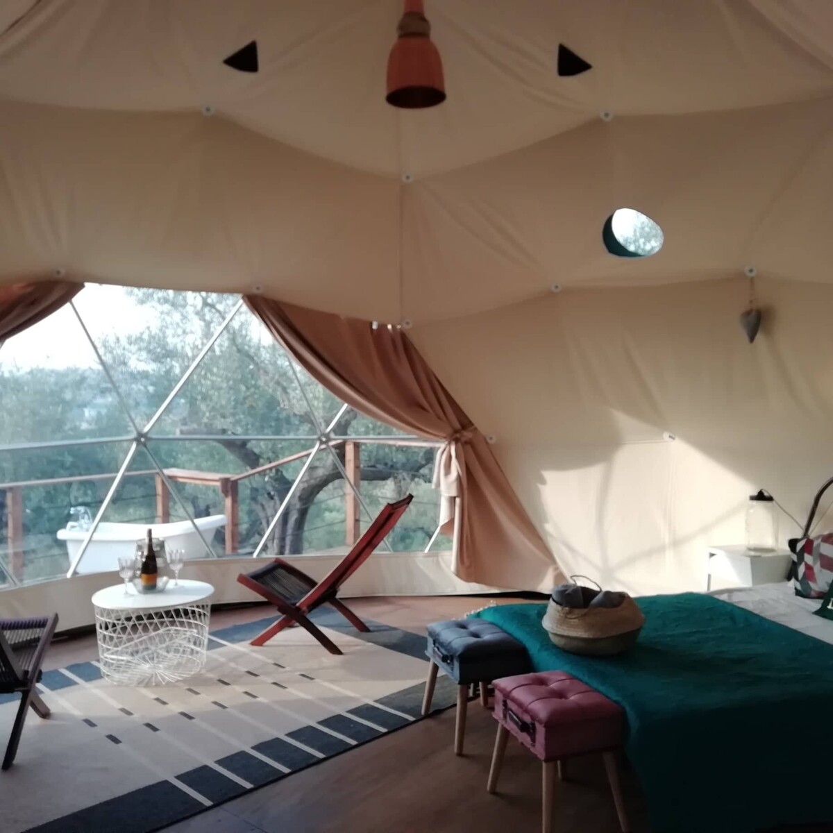 1 panorama Dome with private internal bathroom, kitchen and sleeping areas for up to 4 guests, suitable for self catering option. Large outer terrace and small cooling pool/bath.